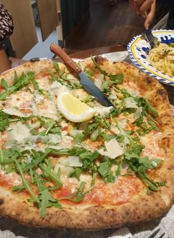 Pastarätt med scampi räkor toppat med rivenost, chili och rucola