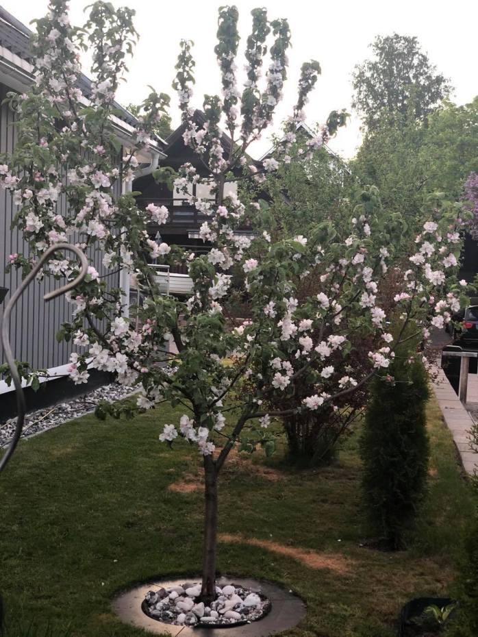 Tyvärr Äppelträdet behöver extra omsorg i år. Igår såg jag att det fanns ganska många kryper på bladen, jätteledsen och ont i hjärta när jag märkte de. Varför och varför nu …. det trädet blommade ju så fint för bara några dagar sen 😦