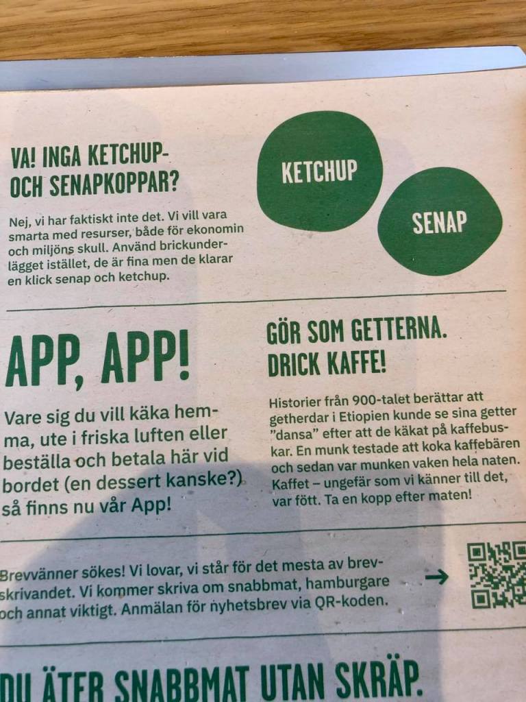 Jag beställde Kycklingburgare till mig som var så god men när jag skulle hämta ketchup och senap så fanns det inga koppar där. Vad? tänkte jag. Hur ska vi då ha ketchup på.