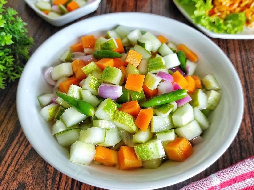 I mitt land brukar vi göra pickles av gurka, scharlottens lök, morot och grönna chilli. Den är vår traditionella pickles och brukar servera tillsammans med Nasi Goreng (friterade ris) eller annan mat. Men eftersom jag inte har alla ingredienserna hemma idag så jag tar det som fanns.